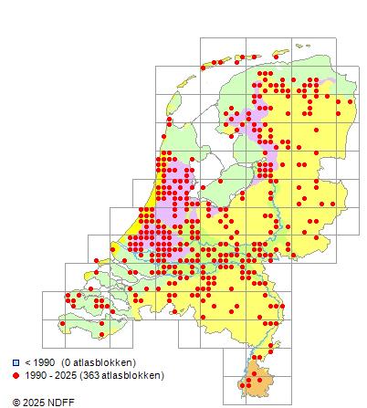 Het aantal atlasblokken (5x5 km) waarin de soort is gemeld binnen een periode van vijf jaar (vanaf 1980) of twintig jaar. Niet gecorrigeerd voor waarnemersinspanning en het aantal doorgegeven waarnemingen kan sterk variëren per periode, dus een trend in verspreiding kan hier niet direct uit worden afgelezen. Het opgegeven jaartal is het eerste jaar van de periode. Bron: gevalideerde waarnemingen uit de NDFF.