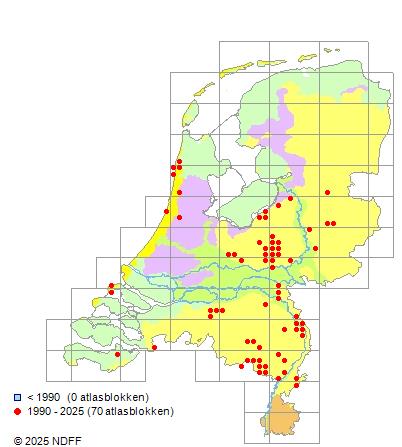 Het aantal atlasblokken (5x5 km) waarin de soort is gemeld binnen een periode van vijf jaar (vanaf 1980) of twintig jaar. Niet gecorrigeerd voor waarnemersinspanning en het aantal doorgegeven waarnemingen kan sterk variëren per periode, dus een trend in verspreiding kan hier niet direct uit worden afgelezen. Het opgegeven jaartal is het eerste jaar van de periode. Bron: gevalideerde waarnemingen uit de NDFF.