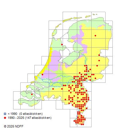 Het aantal atlasblokken (5x5 km) waarin de soort is gemeld binnen een periode van vijf jaar (vanaf 1980) of twintig jaar. Niet gecorrigeerd voor waarnemersinspanning en het aantal doorgegeven waarnemingen kan sterk variëren per periode, dus een trend in verspreiding kan hier niet direct uit worden afgelezen. Het opgegeven jaartal is het eerste jaar van de periode. Bron: gevalideerde waarnemingen uit de NDFF.