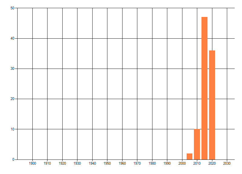 Het aantal atlasblokken (5x5 km) waarin de soort is gemeld binnen een periode van vijf jaar (vanaf 1980) of twintig jaar. Niet gecorrigeerd voor waarnemersinspanning en het aantal doorgegeven waarnemingen kan sterk variëren per periode, dus een trend in verspreiding kan hier niet direct uit worden afgelezen. Het opgegeven jaartal is het eerste jaar van de periode. Bron: gevalideerde waarnemingen uit de NDFF.