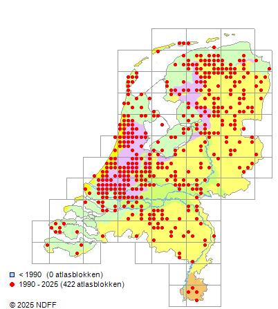 Het aantal atlasblokken (5x5 km) waarin de soort is gemeld binnen een periode van vijf jaar (vanaf 1980) of twintig jaar. Niet gecorrigeerd voor waarnemersinspanning en het aantal doorgegeven waarnemingen kan sterk variëren per periode, dus een trend in verspreiding kan hier niet direct uit worden afgelezen. Het opgegeven jaartal is het eerste jaar van de periode. Bron: gevalideerde waarnemingen uit de NDFF.
