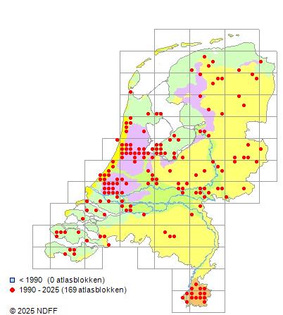 Het aantal atlasblokken (5x5 km) waarin de soort is gemeld binnen een periode van vijf jaar (vanaf 1980) of twintig jaar. Niet gecorrigeerd voor waarnemersinspanning en het aantal doorgegeven waarnemingen kan sterk variëren per periode, dus een trend in verspreiding kan hier niet direct uit worden afgelezen. Het opgegeven jaartal is het eerste jaar van de periode. Bron: gevalideerde waarnemingen uit de NDFF.