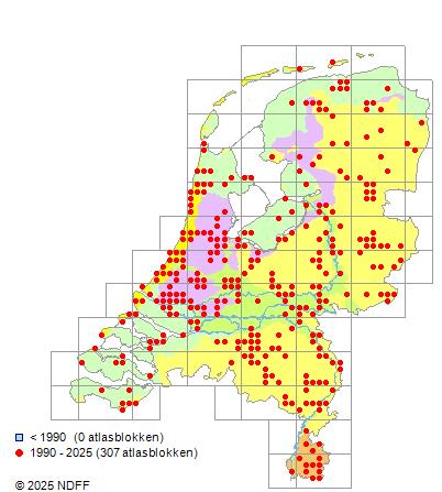 Het aantal atlasblokken (5x5 km) waarin de soort is gemeld binnen een periode van vijf jaar (vanaf 1980) of twintig jaar. Niet gecorrigeerd voor waarnemersinspanning en het aantal doorgegeven waarnemingen kan sterk variëren per periode, dus een trend in verspreiding kan hier niet direct uit worden afgelezen. Het opgegeven jaartal is het eerste jaar van de periode. Bron: gevalideerde waarnemingen uit de NDFF.