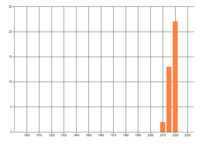 Het aantal atlasblokken (5x5 km) waarin de soort is gemeld binnen een periode van vijf jaar (vanaf 1980) of twintig jaar. Niet gecorrigeerd voor waarnemersinspanning en het aantal doorgegeven waarnemingen kan sterk variëren per periode, dus een trend in verspreiding kan hier niet direct uit worden afgelezen. Het opgegeven jaartal is het eerste jaar van de periode. Bron: gevalideerde waarnemingen uit de NDFF.