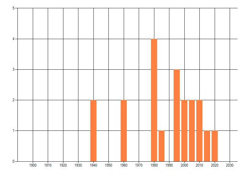 Het aantal atlasblokken (5x5 km) waarin de soort is gemeld binnen een periode van vijf jaar (vanaf 1980) of twintig jaar. Niet gecorrigeerd voor waarnemersinspanning en het aantal doorgegeven waarnemingen kan sterk variëren per periode, dus een trend in verspreiding kan hier niet direct uit worden afgelezen. Het opgegeven jaartal is het eerste jaar van de periode. Bron: gevalideerde waarnemingen uit de NDFF.