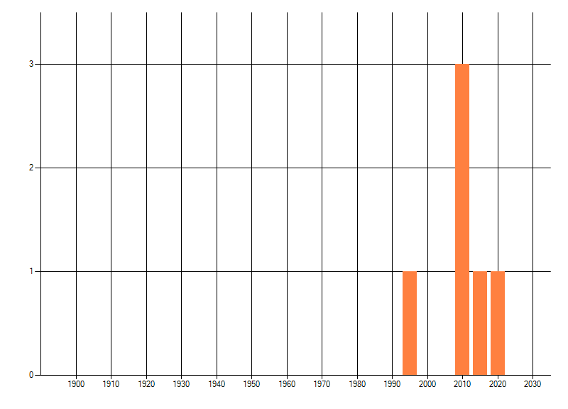 Het aantal atlasblokken (5x5 km) waarin de soort is gemeld binnen een periode van vijf jaar (vanaf 1980) of twintig jaar. Niet gecorrigeerd voor waarnemersinspanning en het aantal doorgegeven waarnemingen kan sterk variëren per periode, dus een trend in verspreiding kan hier niet direct uit worden afgelezen. Het opgegeven jaartal is het eerste jaar van de periode. Bron: gevalideerde waarnemingen uit de NDFF.