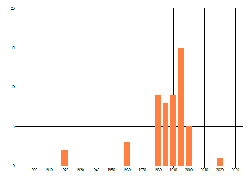 Het aantal atlasblokken (5x5 km) waarin de soort is gemeld binnen een periode van vijf jaar (vanaf 1980) of twintig jaar. Niet gecorrigeerd voor waarnemersinspanning en het aantal doorgegeven waarnemingen kan sterk variëren per periode, dus een trend in verspreiding kan hier niet direct uit worden afgelezen. Het opgegeven jaartal is het eerste jaar van de periode. Bron: gevalideerde waarnemingen uit de NDFF.