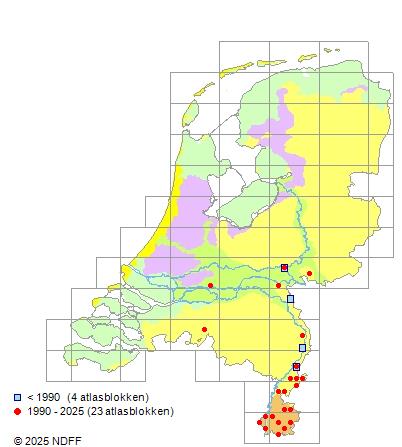 Het aantal atlasblokken (5x5 km) waarin de soort is gemeld binnen een periode van vijf jaar (vanaf 1980) of twintig jaar. Niet gecorrigeerd voor waarnemersinspanning en het aantal doorgegeven waarnemingen kan sterk variëren per periode, dus een trend in verspreiding kan hier niet direct uit worden afgelezen. Het opgegeven jaartal is het eerste jaar van de periode. Bron: gevalideerde waarnemingen uit de NDFF.