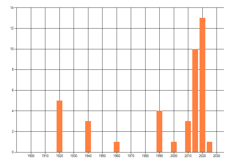 Het aantal atlasblokken (5x5 km) waarin de soort is gemeld binnen een periode van vijf jaar (vanaf 1980) of twintig jaar. Niet gecorrigeerd voor waarnemersinspanning en het aantal doorgegeven waarnemingen kan sterk variëren per periode, dus een trend in verspreiding kan hier niet direct uit worden afgelezen. Het opgegeven jaartal is het eerste jaar van de periode. Bron: gevalideerde waarnemingen uit de NDFF.