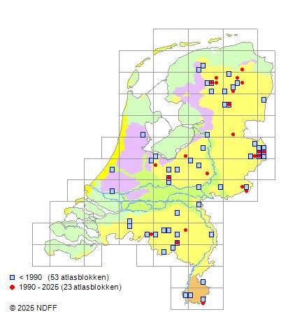 Het aantal atlasblokken (5x5 km) waarin de soort is gemeld binnen een periode van vijf jaar (vanaf 1980) of twintig jaar. Niet gecorrigeerd voor waarnemersinspanning en het aantal doorgegeven waarnemingen kan sterk variëren per periode, dus een trend in verspreiding kan hier niet direct uit worden afgelezen. Het opgegeven jaartal is het eerste jaar van de periode. Bron: gevalideerde waarnemingen uit de NDFF.