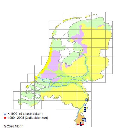 Het aantal atlasblokken (5x5 km) waarin de soort is gemeld binnen een periode van vijf jaar (vanaf 1980) of twintig jaar. Niet gecorrigeerd voor waarnemersinspanning en het aantal doorgegeven waarnemingen kan sterk variëren per periode, dus een trend in verspreiding kan hier niet direct uit worden afgelezen. Het opgegeven jaartal is het eerste jaar van de periode. Bron: gevalideerde waarnemingen uit de NDFF.