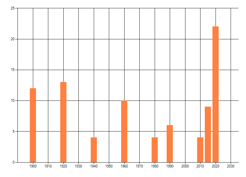 Het aantal atlasblokken (5x5 km) waarin de soort is gemeld binnen een periode van vijf jaar (vanaf 1980) of twintig jaar. Niet gecorrigeerd voor waarnemersinspanning en het aantal doorgegeven waarnemingen kan sterk variëren per periode, dus een trend in verspreiding kan hier niet direct uit worden afgelezen. Het opgegeven jaartal is het eerste jaar van de periode. Bron: gevalideerde waarnemingen uit de NDFF.