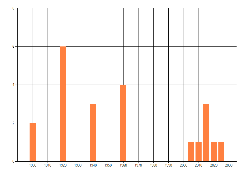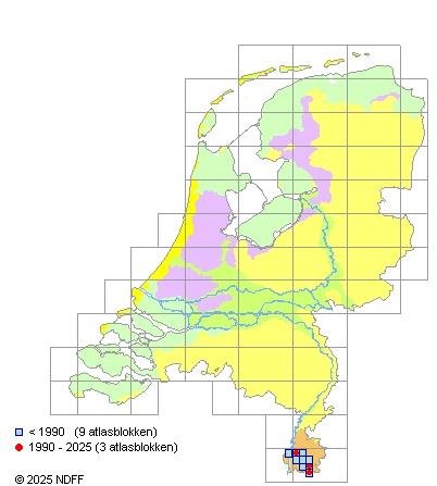 Het aantal atlasblokken (5x5 km) waarin de soort is gemeld binnen een periode van vijf jaar (vanaf 1980) of twintig jaar. Niet gecorrigeerd voor waarnemersinspanning en het aantal doorgegeven waarnemingen kan sterk variëren per periode, dus een trend in verspreiding kan hier niet direct uit worden afgelezen. Het opgegeven jaartal is het eerste jaar van de periode. Bron: gevalideerde waarnemingen uit de NDFF.