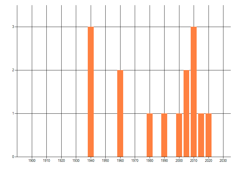 Het aantal atlasblokken (5x5 km) waarin de soort is gemeld binnen een periode van vijf jaar (vanaf 1980) of twintig jaar. Niet gecorrigeerd voor waarnemersinspanning en het aantal doorgegeven waarnemingen kan sterk variëren per periode, dus een trend in verspreiding kan hier niet direct uit worden afgelezen. Het opgegeven jaartal is het eerste jaar van de periode. Bron: gevalideerde waarnemingen uit de NDFF.