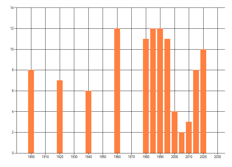 Het aantal atlasblokken (5x5 km) waarin de soort is gemeld binnen een periode van vijf jaar (vanaf 1980) of twintig jaar. Niet gecorrigeerd voor waarnemersinspanning en het aantal doorgegeven waarnemingen kan sterk variëren per periode, dus een trend in verspreiding kan hier niet direct uit worden afgelezen. Het opgegeven jaartal is het eerste jaar van de periode. Bron: gevalideerde waarnemingen uit de NDFF.