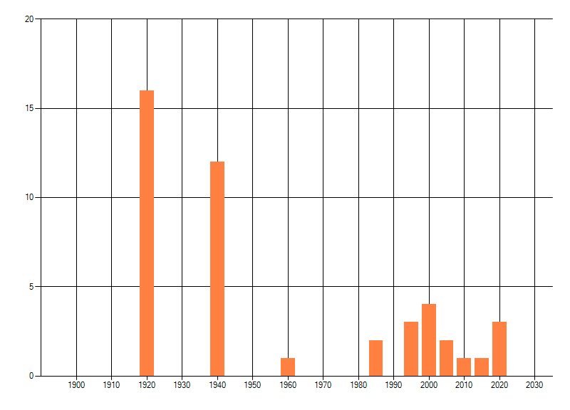 Het aantal atlasblokken (5x5 km) waarin de soort is gemeld binnen een periode van vijf jaar (vanaf 1980) of twintig jaar. Niet gecorrigeerd voor waarnemersinspanning en het aantal doorgegeven waarnemingen kan sterk variëren per periode, dus een trend in verspreiding kan hier niet direct uit worden afgelezen. Het opgegeven jaartal is het eerste jaar van de periode. Bron: gevalideerde waarnemingen uit de NDFF.
