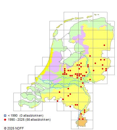 Het aantal atlasblokken (5x5 km) waarin de soort is gemeld binnen een periode van vijf jaar (vanaf 1980) of twintig jaar. Niet gecorrigeerd voor waarnemersinspanning en het aantal doorgegeven waarnemingen kan sterk variëren per periode, dus een trend in verspreiding kan hier niet direct uit worden afgelezen. Het opgegeven jaartal is het eerste jaar van de periode. Bron: gevalideerde waarnemingen uit de NDFF.