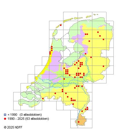 Het aantal atlasblokken (5x5 km) waarin de soort is gemeld binnen een periode van vijf jaar (vanaf 1980) of twintig jaar. Niet gecorrigeerd voor waarnemersinspanning en het aantal doorgegeven waarnemingen kan sterk variëren per periode, dus een trend in verspreiding kan hier niet direct uit worden afgelezen. Het opgegeven jaartal is het eerste jaar van de periode. Bron: gevalideerde waarnemingen uit de NDFF.