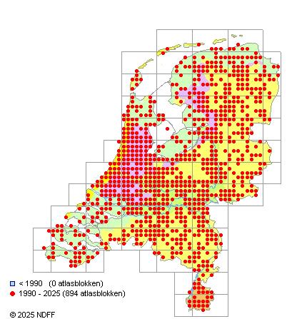 Het aantal atlasblokken (5x5 km) waarin de soort is gemeld binnen een periode van vijf jaar (vanaf 1980) of twintig jaar. Niet gecorrigeerd voor waarnemersinspanning en het aantal doorgegeven waarnemingen kan sterk variëren per periode, dus een trend in verspreiding kan hier niet direct uit worden afgelezen. Het opgegeven jaartal is het eerste jaar van de periode. Bron: gevalideerde waarnemingen uit de NDFF.