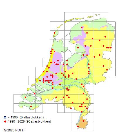 Het aantal atlasblokken (5x5 km) waarin de soort is gemeld binnen een periode van vijf jaar (vanaf 1980) of twintig jaar. Niet gecorrigeerd voor waarnemersinspanning en het aantal doorgegeven waarnemingen kan sterk variëren per periode, dus een trend in verspreiding kan hier niet direct uit worden afgelezen. Het opgegeven jaartal is het eerste jaar van de periode. Bron: gevalideerde waarnemingen uit de NDFF.