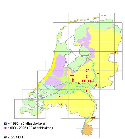 Het aantal atlasblokken (5x5 km) waarin de soort is gemeld binnen een periode van vijf jaar (vanaf 1980) of twintig jaar. Niet gecorrigeerd voor waarnemersinspanning en het aantal doorgegeven waarnemingen kan sterk variëren per periode, dus een trend in verspreiding kan hier niet direct uit worden afgelezen. Het opgegeven jaartal is het eerste jaar van de periode. Bron: gevalideerde waarnemingen uit de NDFF.