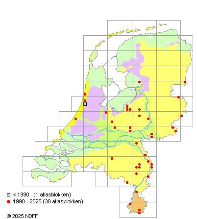 Het aantal atlasblokken (5x5 km) waarin de soort is gemeld binnen een periode van vijf jaar (vanaf 1980) of twintig jaar. Niet gecorrigeerd voor waarnemersinspanning en het aantal doorgegeven waarnemingen kan sterk variëren per periode, dus een trend in verspreiding kan hier niet direct uit worden afgelezen. Het opgegeven jaartal is het eerste jaar van de periode. Bron: gevalideerde waarnemingen uit de NDFF.