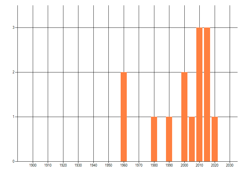 Het aantal atlasblokken (5x5 km) waarin de soort is gemeld binnen een periode van vijf jaar (vanaf 1980) of twintig jaar. Niet gecorrigeerd voor waarnemersinspanning en het aantal doorgegeven waarnemingen kan sterk variëren per periode, dus een trend in verspreiding kan hier niet direct uit worden afgelezen. Het opgegeven jaartal is het eerste jaar van de periode. Bron: gevalideerde waarnemingen uit de NDFF.