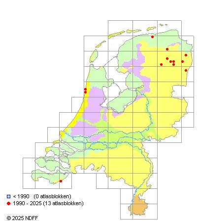 Het aantal atlasblokken (5x5 km) waarin de soort is gemeld binnen een periode van vijf jaar (vanaf 1980) of twintig jaar. Niet gecorrigeerd voor waarnemersinspanning en het aantal doorgegeven waarnemingen kan sterk variëren per periode, dus een trend in verspreiding kan hier niet direct uit worden afgelezen. Het opgegeven jaartal is het eerste jaar van de periode. Bron: gevalideerde waarnemingen uit de NDFF.