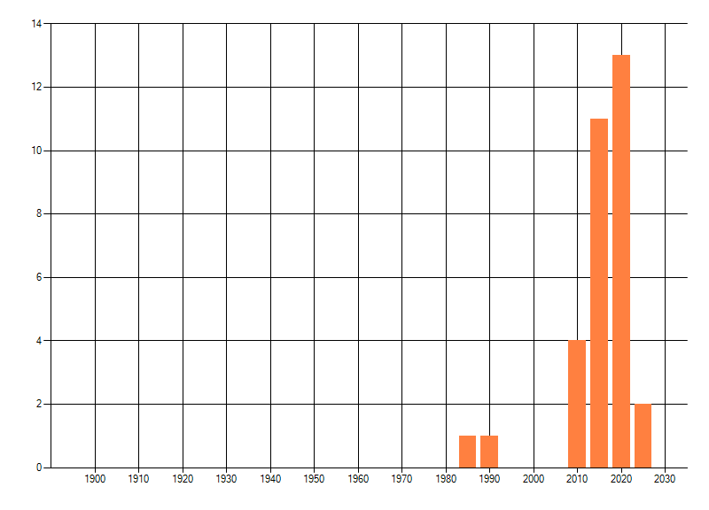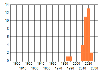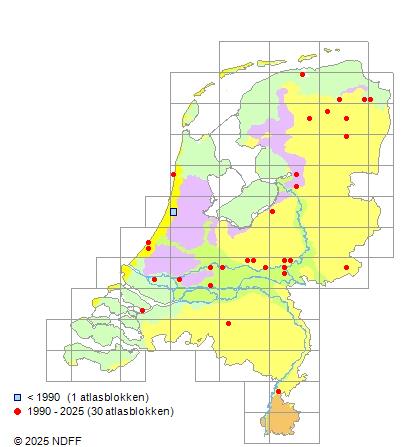 Het aantal atlasblokken (5x5 km) waarin de soort is gemeld binnen een periode van vijf jaar (vanaf 1980) of twintig jaar. Niet gecorrigeerd voor waarnemersinspanning en het aantal doorgegeven waarnemingen kan sterk variëren per periode, dus een trend in verspreiding kan hier niet direct uit worden afgelezen. Het opgegeven jaartal is het eerste jaar van de periode. Bron: gevalideerde waarnemingen uit de NDFF.