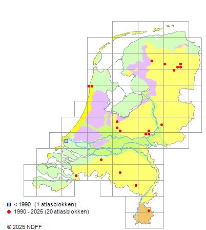 Het aantal atlasblokken (5x5 km) waarin de soort is gemeld binnen een periode van vijf jaar (vanaf 1980) of twintig jaar. Niet gecorrigeerd voor waarnemersinspanning en het aantal doorgegeven waarnemingen kan sterk variëren per periode, dus een trend in verspreiding kan hier niet direct uit worden afgelezen. Het opgegeven jaartal is het eerste jaar van de periode. Bron: gevalideerde waarnemingen uit de NDFF.