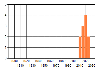 Het aantal atlasblokken (5x5 km) waarin de soort is gemeld binnen een periode van vijf jaar (vanaf 1980) of twintig jaar. Niet gecorrigeerd voor waarnemersinspanning en het aantal doorgegeven waarnemingen kan sterk variëren per periode, dus een trend in verspreiding kan hier niet direct uit worden afgelezen. Het opgegeven jaartal is het eerste jaar van de periode. Bron: gevalideerde waarnemingen uit de NDFF.