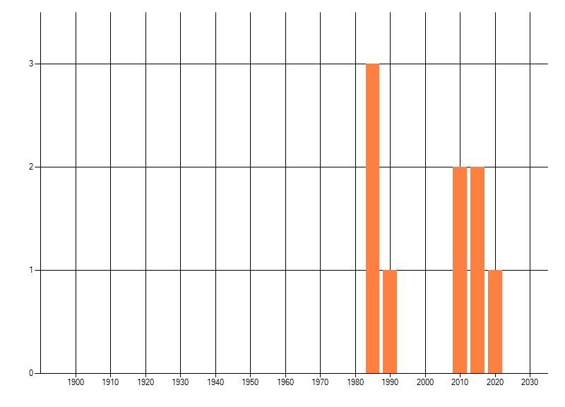 Het aantal atlasblokken (5x5 km) waarin de soort is gemeld binnen een periode van vijf jaar (vanaf 1980) of twintig jaar. Niet gecorrigeerd voor waarnemersinspanning en het aantal doorgegeven waarnemingen kan sterk variëren per periode, dus een trend in verspreiding kan hier niet direct uit worden afgelezen. Het opgegeven jaartal is het eerste jaar van de periode. Bron: gevalideerde waarnemingen uit de NDFF.
