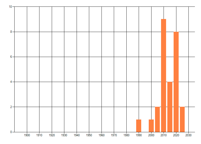 Het aantal atlasblokken (5x5 km) waarin de soort is gemeld binnen een periode van vijf jaar (vanaf 1980) of twintig jaar. Niet gecorrigeerd voor waarnemersinspanning en het aantal doorgegeven waarnemingen kan sterk variëren per periode, dus een trend in verspreiding kan hier niet direct uit worden afgelezen. Het opgegeven jaartal is het eerste jaar van de periode. Bron: gevalideerde waarnemingen uit de NDFF.