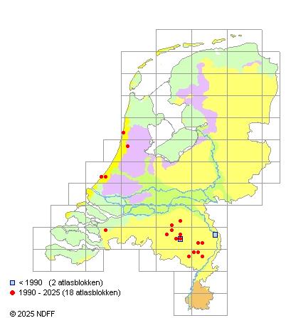 Het aantal atlasblokken (5x5 km) waarin de soort is gemeld binnen een periode van vijf jaar (vanaf 1980) of twintig jaar. Niet gecorrigeerd voor waarnemersinspanning en het aantal doorgegeven waarnemingen kan sterk variëren per periode, dus een trend in verspreiding kan hier niet direct uit worden afgelezen. Het opgegeven jaartal is het eerste jaar van de periode. Bron: gevalideerde waarnemingen uit de NDFF.