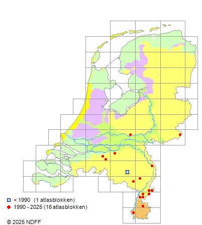 Het aantal atlasblokken (5x5 km) waarin de soort is gemeld binnen een periode van vijf jaar (vanaf 1980) of twintig jaar. Niet gecorrigeerd voor waarnemersinspanning en het aantal doorgegeven waarnemingen kan sterk variëren per periode, dus een trend in verspreiding kan hier niet direct uit worden afgelezen. Het opgegeven jaartal is het eerste jaar van de periode. Bron: gevalideerde waarnemingen uit de NDFF.