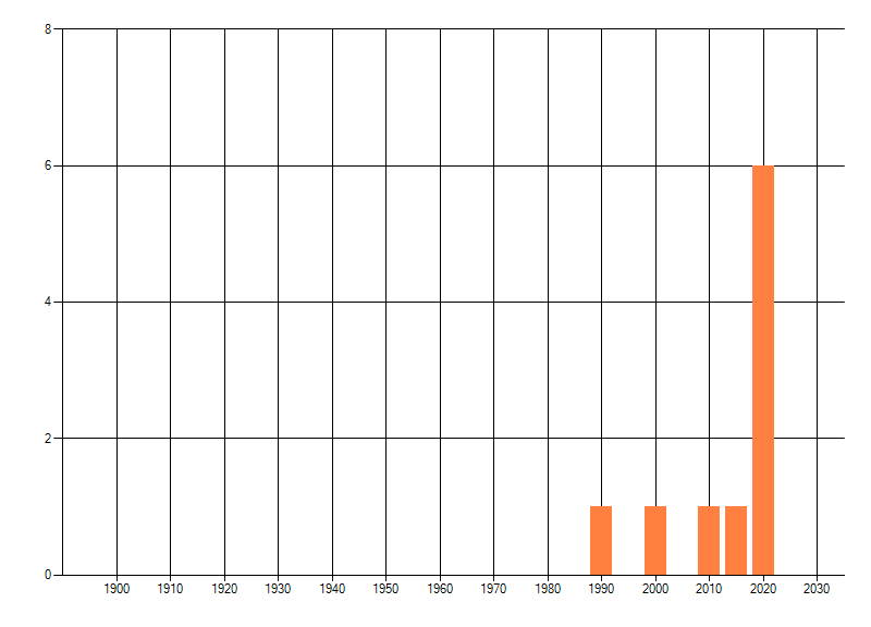 Het aantal atlasblokken (5x5 km) waarin de soort is gemeld binnen een periode van vijf jaar (vanaf 1980) of twintig jaar. Niet gecorrigeerd voor waarnemersinspanning en het aantal doorgegeven waarnemingen kan sterk variëren per periode, dus een trend in verspreiding kan hier niet direct uit worden afgelezen. Het opgegeven jaartal is het eerste jaar van de periode. Bron: gevalideerde waarnemingen uit de NDFF.