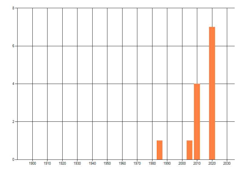 Het aantal atlasblokken (5x5 km) waarin de soort is gemeld binnen een periode van vijf jaar (vanaf 1980) of twintig jaar. Niet gecorrigeerd voor waarnemersinspanning en het aantal doorgegeven waarnemingen kan sterk variëren per periode, dus een trend in verspreiding kan hier niet direct uit worden afgelezen. Het opgegeven jaartal is het eerste jaar van de periode. Bron: gevalideerde waarnemingen uit de NDFF.
