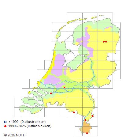 Het aantal atlasblokken (5x5 km) waarin de soort is gemeld binnen een periode van vijf jaar (vanaf 1980) of twintig jaar. Niet gecorrigeerd voor waarnemersinspanning en het aantal doorgegeven waarnemingen kan sterk variëren per periode, dus een trend in verspreiding kan hier niet direct uit worden afgelezen. Het opgegeven jaartal is het eerste jaar van de periode. Bron: gevalideerde waarnemingen uit de NDFF.