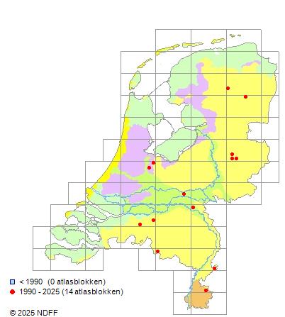 Het aantal atlasblokken (5x5 km) waarin de soort is gemeld binnen een periode van vijf jaar (vanaf 1980) of twintig jaar. Niet gecorrigeerd voor waarnemersinspanning en het aantal doorgegeven waarnemingen kan sterk variëren per periode, dus een trend in verspreiding kan hier niet direct uit worden afgelezen. Het opgegeven jaartal is het eerste jaar van de periode. Bron: gevalideerde waarnemingen uit de NDFF.