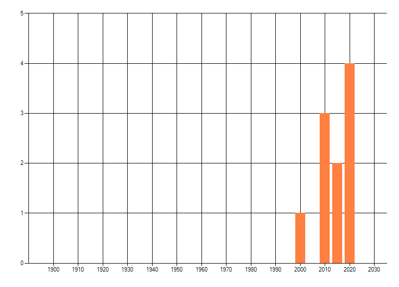 Het aantal atlasblokken (5x5 km) waarin de soort is gemeld binnen een periode van vijf jaar (vanaf 1980) of twintig jaar. Niet gecorrigeerd voor waarnemersinspanning en het aantal doorgegeven waarnemingen kan sterk variëren per periode, dus een trend in verspreiding kan hier niet direct uit worden afgelezen. Het opgegeven jaartal is het eerste jaar van de periode. Bron: gevalideerde waarnemingen uit de NDFF.