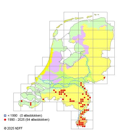 Het aantal atlasblokken (5x5 km) waarin de soort is gemeld binnen een periode van vijf jaar (vanaf 1980) of twintig jaar. Niet gecorrigeerd voor waarnemersinspanning en het aantal doorgegeven waarnemingen kan sterk variëren per periode, dus een trend in verspreiding kan hier niet direct uit worden afgelezen. Het opgegeven jaartal is het eerste jaar van de periode. Bron: gevalideerde waarnemingen uit de NDFF.