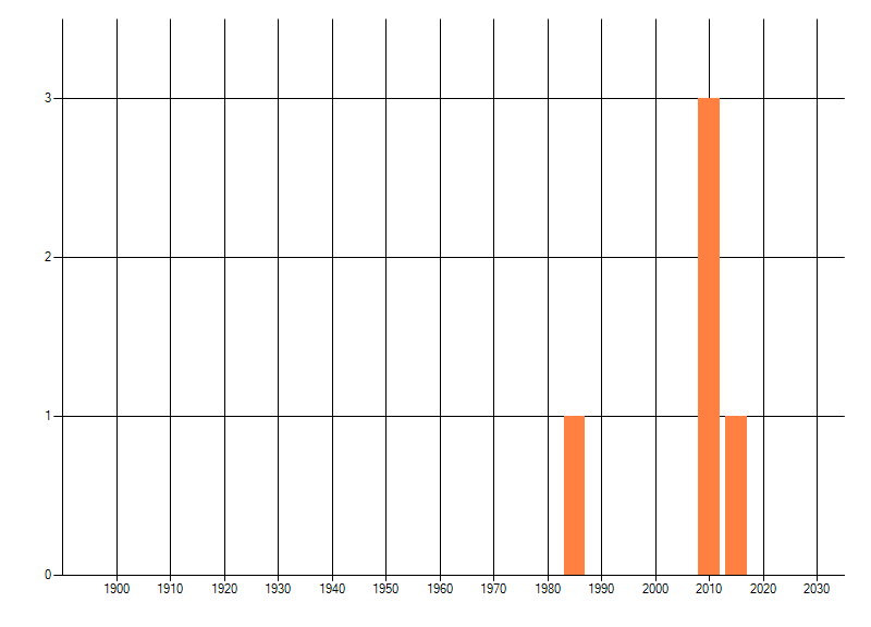 Het aantal atlasblokken (5x5 km) waarin de soort is gemeld binnen een periode van vijf jaar (vanaf 1980) of twintig jaar. Niet gecorrigeerd voor waarnemersinspanning en het aantal doorgegeven waarnemingen kan sterk variëren per periode, dus een trend in verspreiding kan hier niet direct uit worden afgelezen. Het opgegeven jaartal is het eerste jaar van de periode. Bron: gevalideerde waarnemingen uit de NDFF.