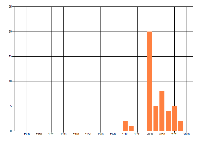 Het aantal atlasblokken (5x5 km) waarin de soort is gemeld binnen een periode van vijf jaar (vanaf 1980) of twintig jaar. Niet gecorrigeerd voor waarnemersinspanning en het aantal doorgegeven waarnemingen kan sterk variëren per periode, dus een trend in verspreiding kan hier niet direct uit worden afgelezen. Het opgegeven jaartal is het eerste jaar van de periode. Bron: gevalideerde waarnemingen uit de NDFF.