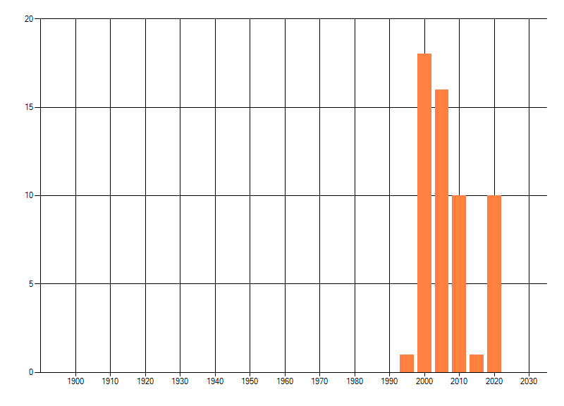 Het aantal atlasblokken (5x5 km) waarin de soort is gemeld binnen een periode van vijf jaar (vanaf 1980) of twintig jaar. Niet gecorrigeerd voor waarnemersinspanning en het aantal doorgegeven waarnemingen kan sterk variëren per periode, dus een trend in verspreiding kan hier niet direct uit worden afgelezen. Het opgegeven jaartal is het eerste jaar van de periode. Bron: gevalideerde waarnemingen uit de NDFF.