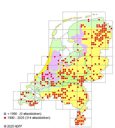 Het aantal atlasblokken (5x5 km) waarin de soort is gemeld binnen een periode van vijf jaar (vanaf 1980) of twintig jaar. Niet gecorrigeerd voor waarnemersinspanning en het aantal doorgegeven waarnemingen kan sterk variëren per periode, dus een trend in verspreiding kan hier niet direct uit worden afgelezen. Het opgegeven jaartal is het eerste jaar van de periode. Bron: gevalideerde waarnemingen uit de NDFF.
