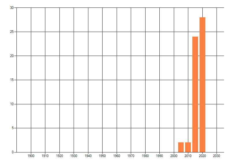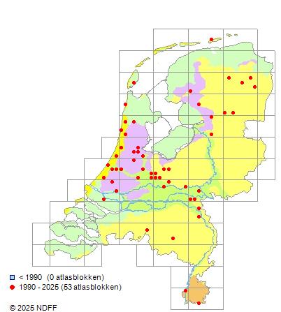 Het aantal atlasblokken (5x5 km) waarin de soort is gemeld binnen een periode van vijf jaar (vanaf 1980) of twintig jaar. Niet gecorrigeerd voor waarnemersinspanning en het aantal doorgegeven waarnemingen kan sterk variëren per periode, dus een trend in verspreiding kan hier niet direct uit worden afgelezen. Het opgegeven jaartal is het eerste jaar van de periode. Bron: gevalideerde waarnemingen uit de NDFF.