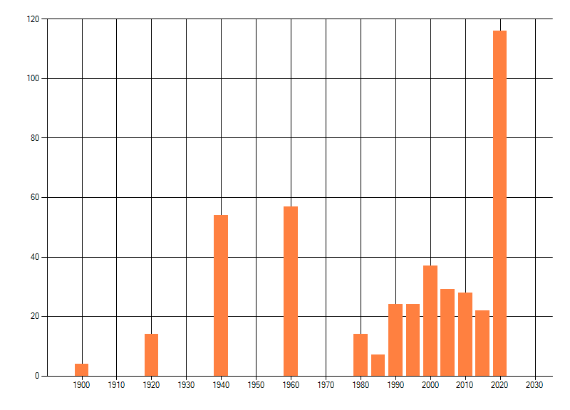 Het aantal atlasblokken (5x5 km) waarin de soort is gemeld binnen een periode van vijf jaar (vanaf 1980) of twintig jaar. Niet gecorrigeerd voor waarnemersinspanning en het aantal doorgegeven waarnemingen kan sterk variëren per periode, dus een trend in verspreiding kan hier niet direct uit worden afgelezen. Het opgegeven jaartal is het eerste jaar van de periode. Bron: gevalideerde waarnemingen uit de NDFF.