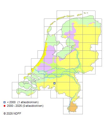Het aantal atlasblokken (5x5 km) waarin de soort is gemeld binnen een periode van vijf jaar (vanaf 1980) of twintig jaar. Niet gecorrigeerd voor waarnemersinspanning en het aantal doorgegeven waarnemingen kan sterk variëren per periode, dus een trend in verspreiding kan hier niet direct uit worden afgelezen. Het opgegeven jaartal is het eerste jaar van de periode. Bron: gevalideerde waarnemingen uit de NDFF.