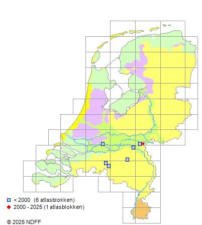 Het aantal atlasblokken (5x5 km) waarin de soort is gemeld binnen een periode van vijf jaar (vanaf 1980) of twintig jaar. Niet gecorrigeerd voor waarnemersinspanning en het aantal doorgegeven waarnemingen kan sterk variëren per periode, dus een trend in verspreiding kan hier niet direct uit worden afgelezen. Het opgegeven jaartal is het eerste jaar van de periode. Bron: gevalideerde waarnemingen uit de NDFF.