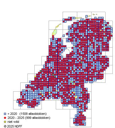 Het aantal atlasblokken (5x5 km) waarin de soort is gemeld binnen een periode van vijf jaar (vanaf 1980) of twintig jaar. Niet gecorrigeerd voor waarnemersinspanning en het aantal doorgegeven waarnemingen kan sterk variëren per periode, dus een trend in verspreiding kan hier niet direct uit worden afgelezen. Het opgegeven jaartal is het eerste jaar van de periode. Bron: gevalideerde waarnemingen uit de NDFF.